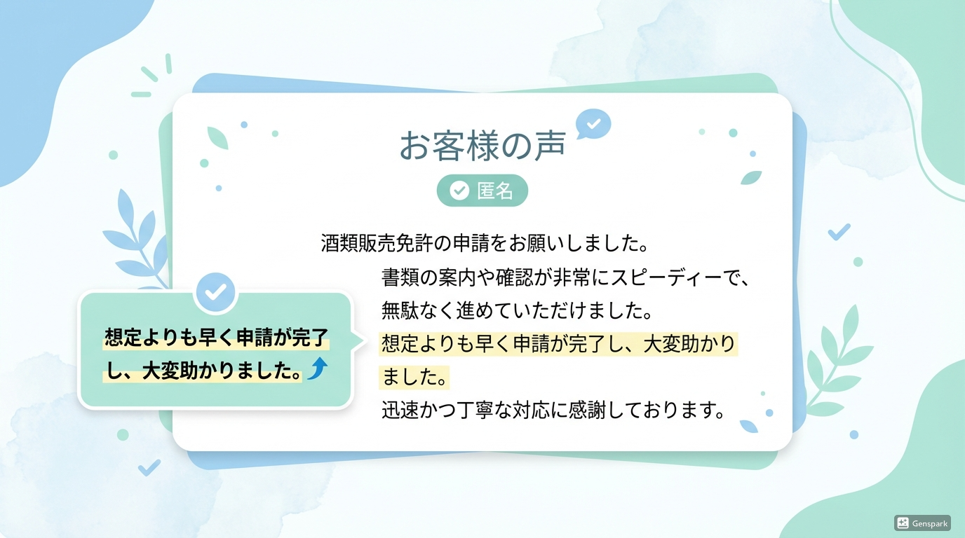 スピード対応に感謝しています 2026.02.11 酒類販売免許の申請をお願いしました。書類の案内や確認が非常にスピーディーで、無駄なく進めていただけました。想定よりも早く申請が完了し、大変助かりました。 迅速かつ丁寧な対応に感謝しております。 2025年12月21日